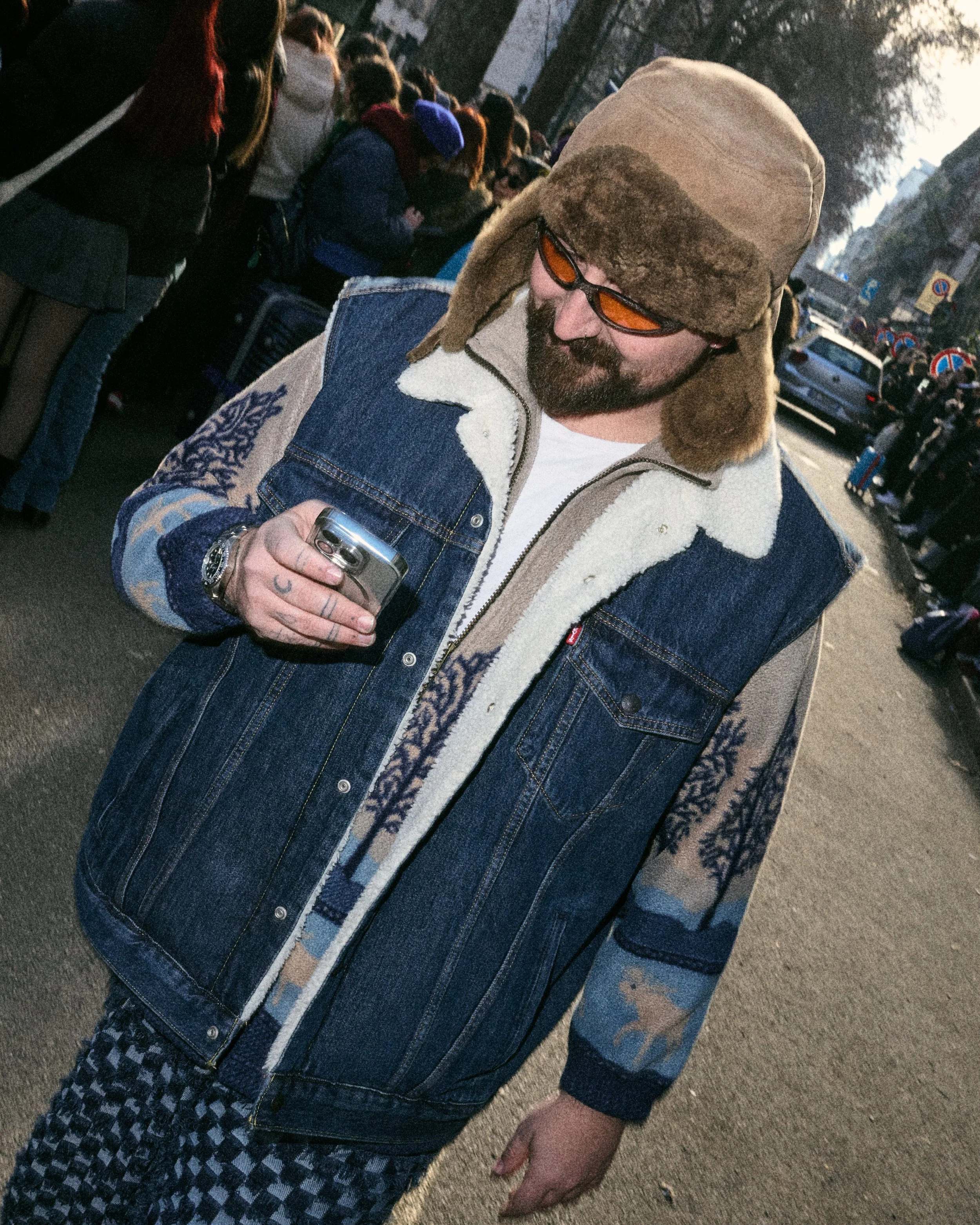 Women paid homage to vintage glamour with headscarves tied Jackie O-style, paired with oversized sunglasses and strings of pearls. Outerwear took center stage as well—faux fur coats in monochromatic ensembles and velvety mustard bomber jackets added texture and drama. Accessories were equally bold: square glasses, sparkling embellishments, and cowboy boots turned heads, as did the occasional floor-length coat.